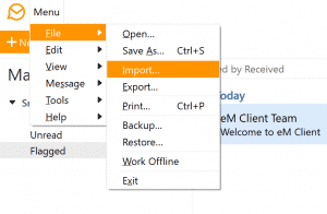 Hvis du leter etter en guide for hvordan du overfører IncrediMail-e-post til en annen datamaskin, det er en løsning på dette også. Dette kan gjøres hvis du har sikkerhetskopiert data fra IncrediMail hentet før den offisielle nedleggelsen av klienten. Hvis importverktøyet til eM Client ikke kan oppdage IncrediMail-kontodata, Du kan fremdeles importere meldinger og kontakter til klienten. Etter installasjonen, gå til Meny, trykke på Filen, og velg Import. Hvis du trenger, la oss si, for å overføre IncrediMail sendt mail til eM Client, finn filene med sendte meldinger på harddisken og importer dem.