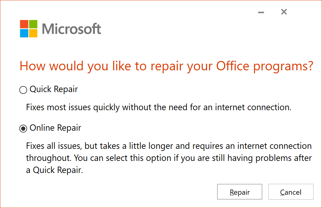 Еще, Ваш Outlook 2016 сбой при отправке по электронной почте или работать, и вы понятия не имеете, почему. Управление может быть восстановлено с помощью ‘Удаление программы‘ меню (находится на панели управления). Щелкните правой кнопкой мыши на бюро и прослеживание с «Изменение’ и «Интернет Ремонт».